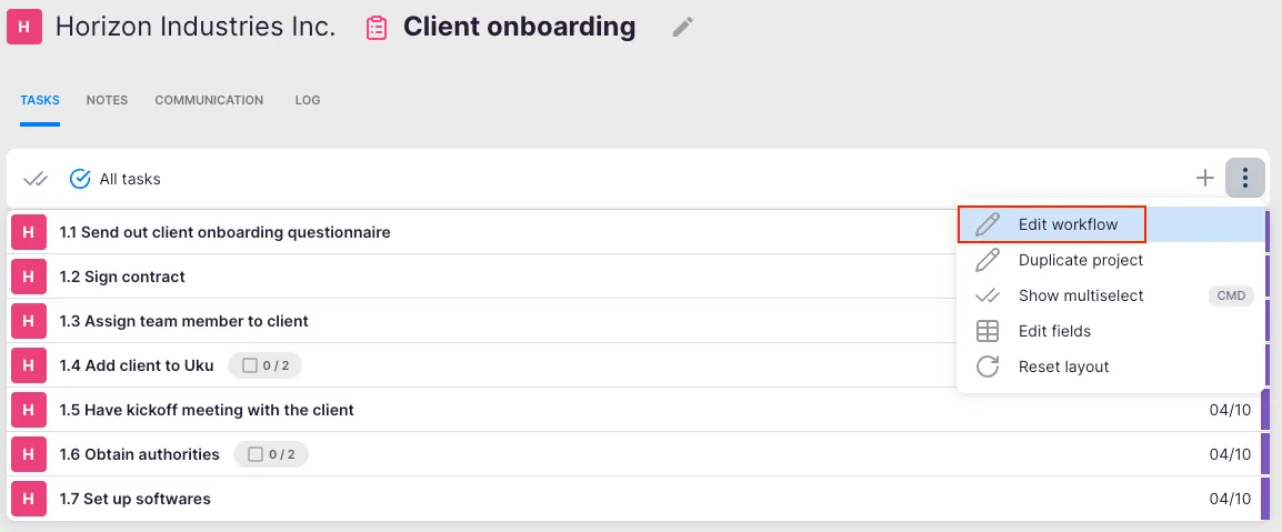 - Open the three-dot menu on the project and select Edit workflow to access the workflow creation view.