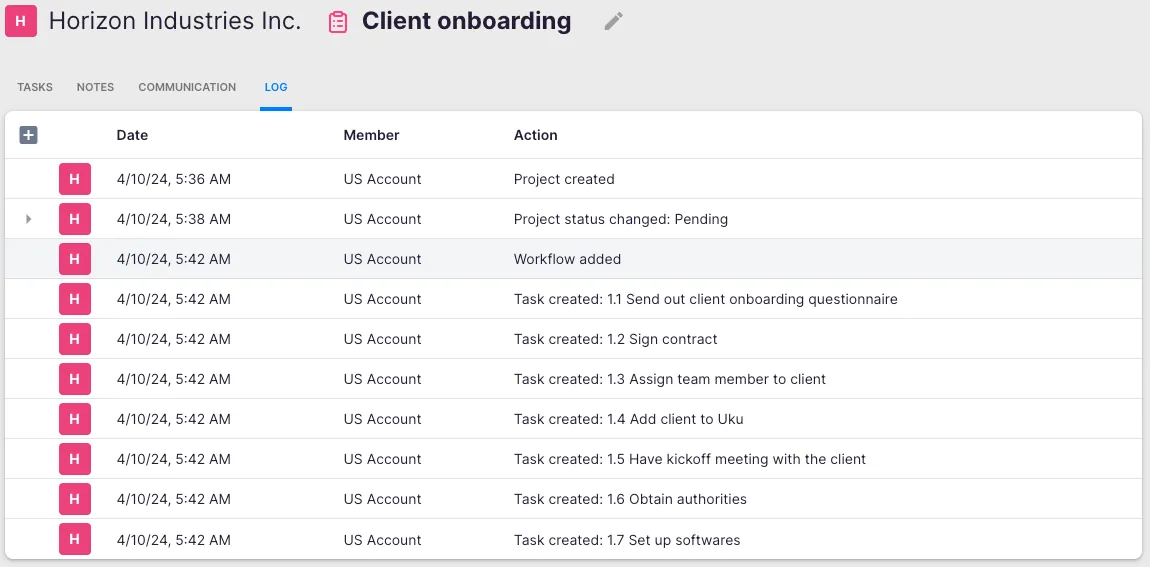 Section titled “Project card overview”The project card displays key project information. You can enter notes related to the project, and the Logs section shows who performed which activities on the project.
