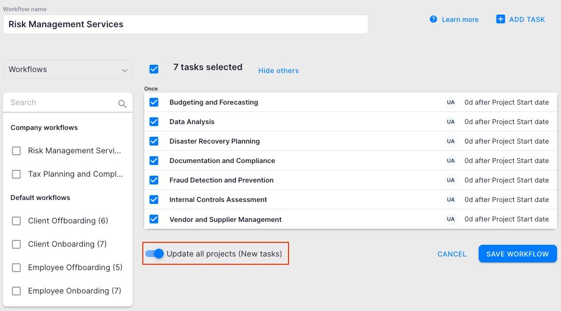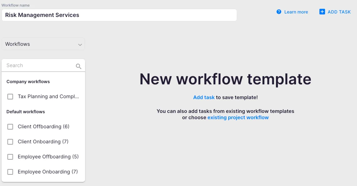 Project workflow templates define the tasks, assignees, required statuses, and date dependencies for a project type. Creating company-specific templates ensures consistency and completeness across all projects of the same type — for example, a tax return template that covers every step from data collection to filing.