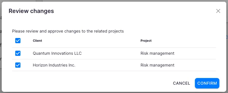Section titled “How template updates work”When you save changes to a workflow template, Uku displays all active projects that use that template. By default, changes apply to all active projects (excluding archived ones). Remove any project from the list if you do not want the update to apply to it.