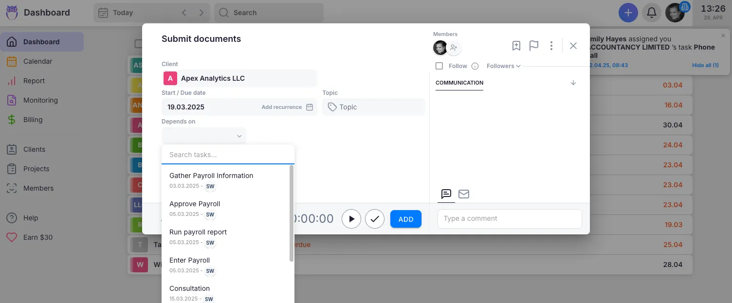 - Click the dependency icon in the task footer to open the Depends on field. The dropdown lists this client’s tasks within a 45-day window.