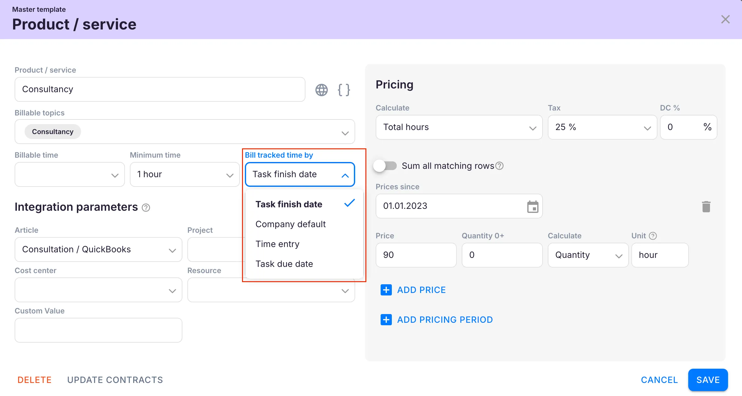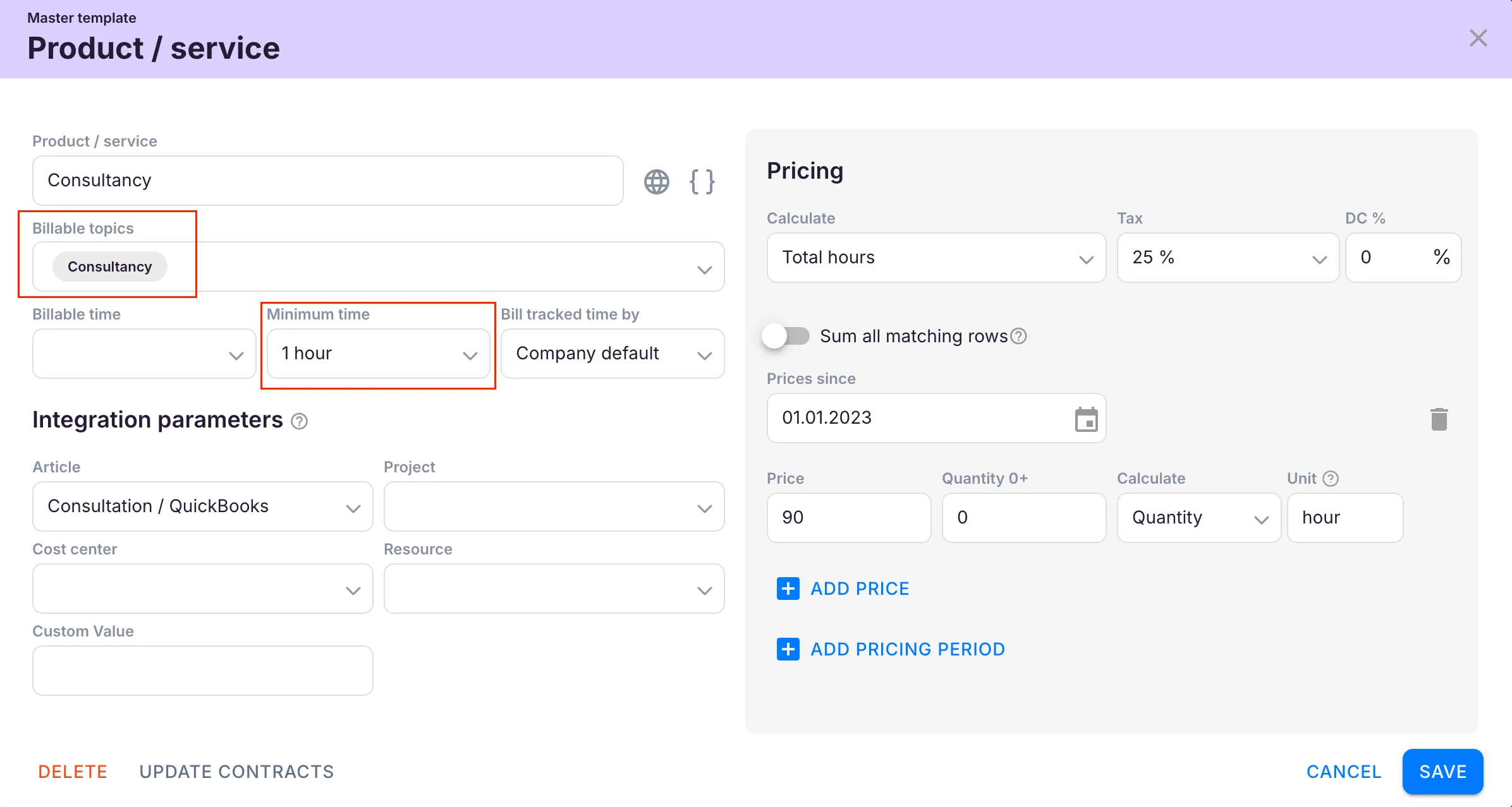 Section titled “Minimum time”Set a minimum billable time that is always charged, even if less time was tracked. For example, ensuring at least 1 hour is charged even if only 5 minutes were logged.