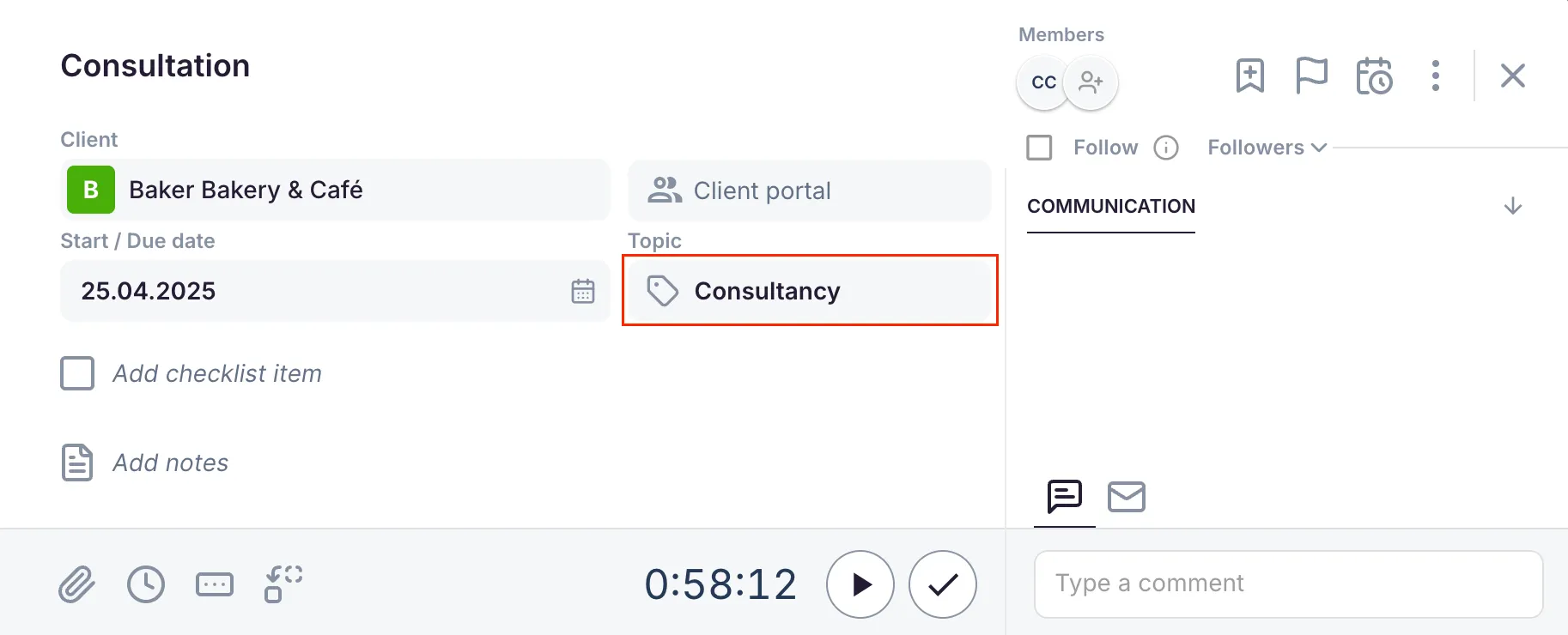 Section titled “Topic selection”Restrict billing to hours from tasks with a specific topic. When a topic is set, only time tracked on tasks with that topic is included in the billing calculation.
