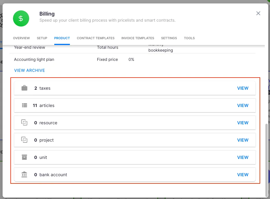 Section titled “Preparation before creating products”Before creating products, set up these supporting records in Settings & Apps > Billing > Setup: