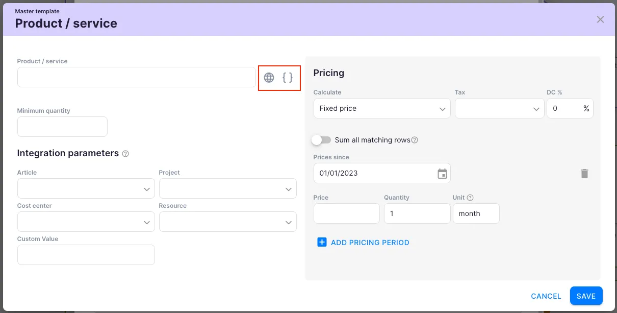- Optionally, add pricing tiers, an article code, custom fields, and translations for other languages.