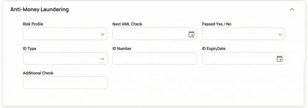 Section titled “1. AML: Contact-level compliance fields”AML app logic now extends to contacts, not just clients. The same fields that were previously created only at the client level are now also available for contacts.