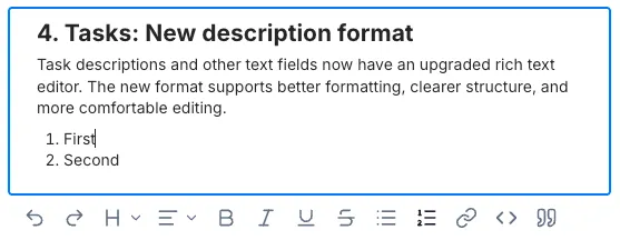 Section titled “4. Tasks: New description format”Task descriptions and other text fields now have an upgraded rich text editor. The new format supports better formatting, clearer structure, and more comfortable editing.