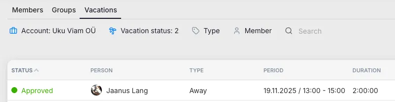 Section titled “7. Members: Vacations overview”The member list now includes a vacations overview where you can see all members’ time off in one place and conveniently approve leave requests.