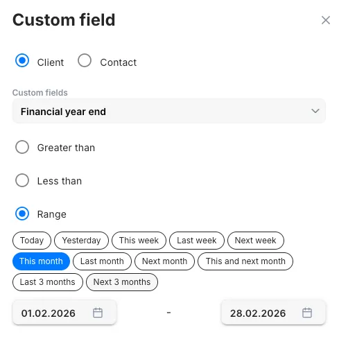 Section titled “9. Clients: Smart date field options”Client custom date fields now support dynamic date ranges. Filters update automatically and never need manual adjustments.