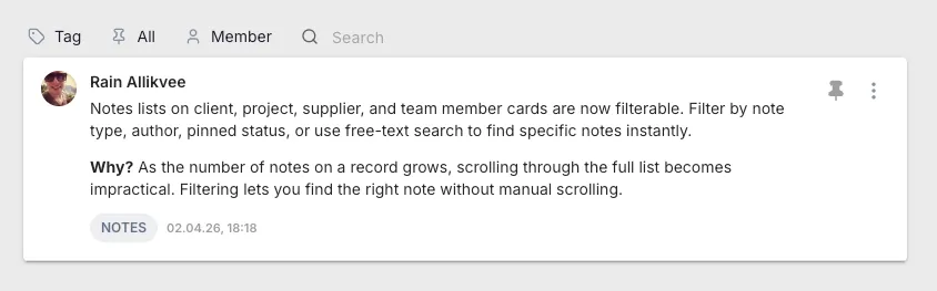 Note lists on client, project, supplier, and member cards are now filterable. Filter by type, author, pinned status, or use free-text search.