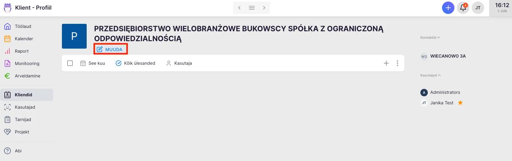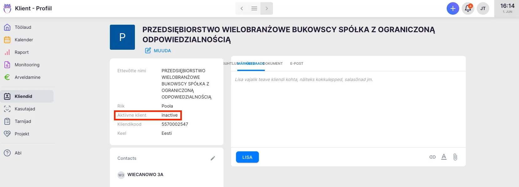 Section titled “Kuidas deaktiveerida klienti?”- Vali peamenüüs “Kliendid” ning ava deaktiveeritava kliendi profiil.