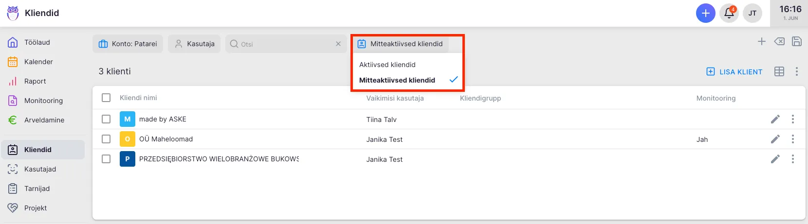 Section titled “Kuidas aktiveerida klienti?”Vali peamenüüst “Kliendid”. Seejärel vali ülevalt filtrist “Mitteaktiivsed kliendid”.