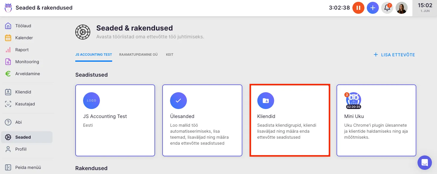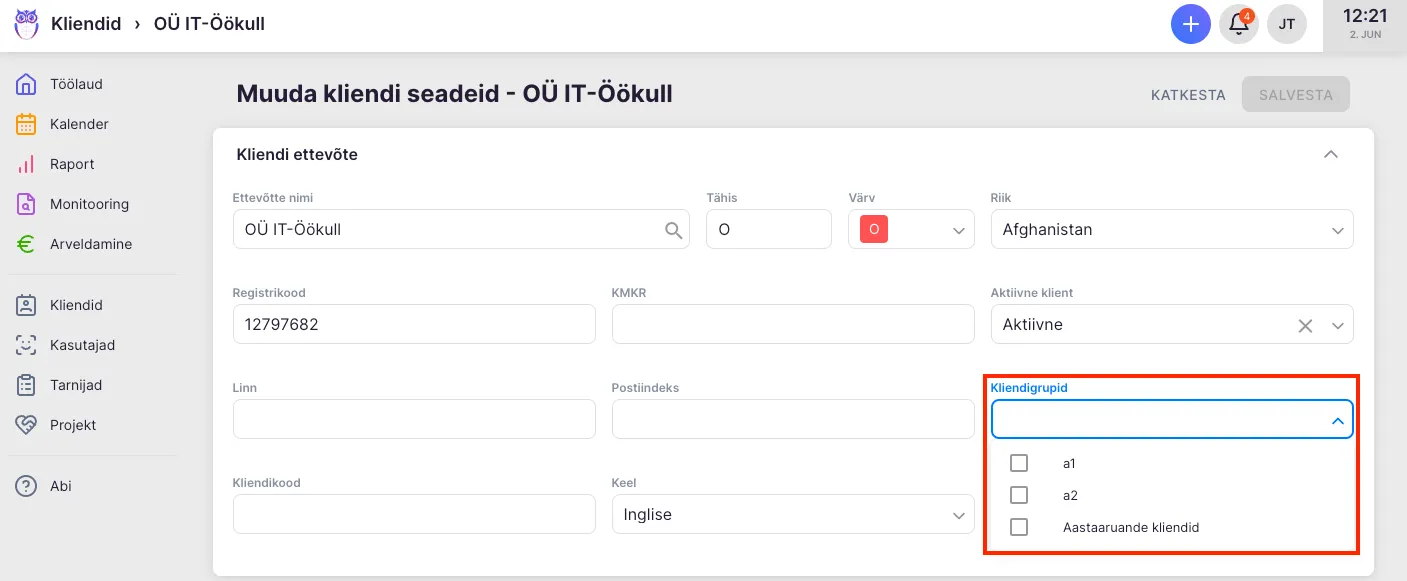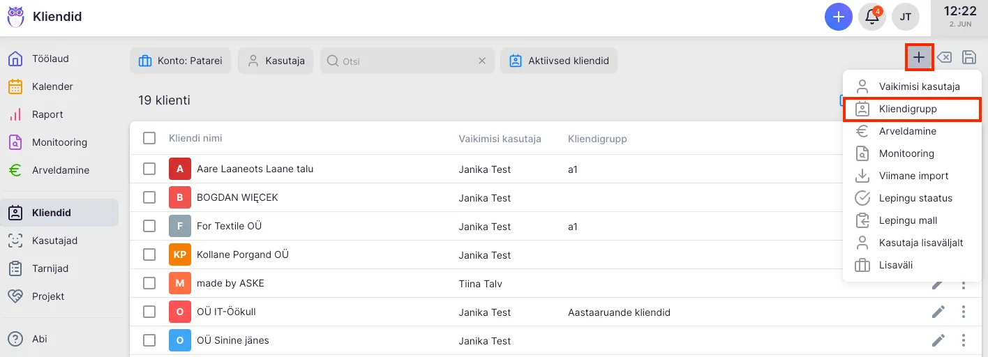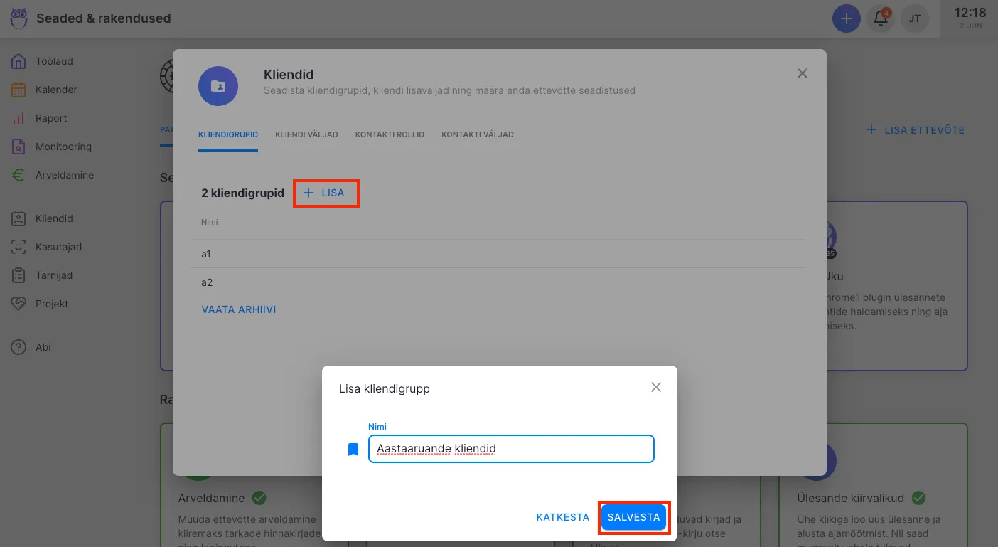 Seadete all on rippmenüü loodud kliendigruppidega. Kliendi saad lisada vajadusel mitmesse kliendigruppi.