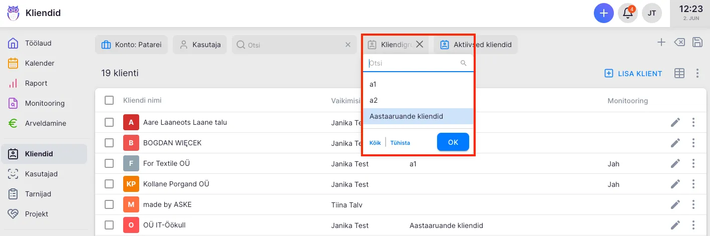 Klientide segmenteerimise tuleb sulle kasuks raportis, kus on võimalik koostada erinevate gruppide põhiselt aruandeid, jälgida tööde täitmist ja tööaja kasutust erinevatele kliendisegmentidele.