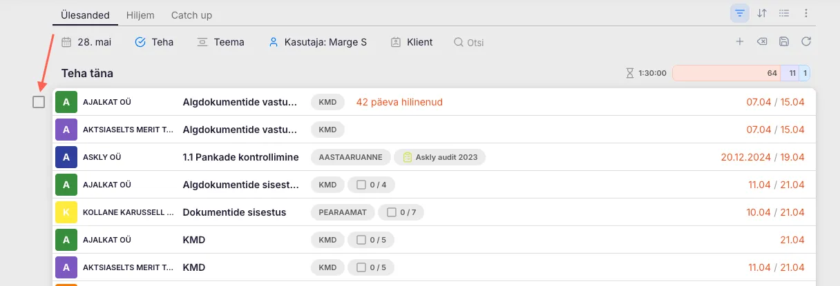 Liigu hiirega ülesande rea vasakule – kliendi nime ette ilmub valikukast.