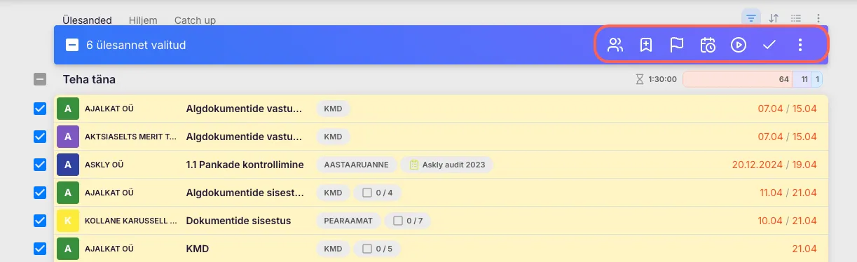 Hulgitoimingutega saab korraga teha muudatusi mitmele ülesandele, säästes aega ja hoides töökorralduse selge. Toimingute hulka kuuluvad kasutajate määramine, staatuse muutmine, tähtaegade nihutamine, ajakirjete lisamine ja ülesannete arhiveerimine.