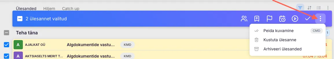 NB! Hulgitoimingute menüü avaneb kui linnutad ülesande(d).