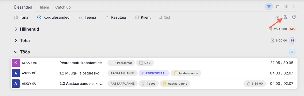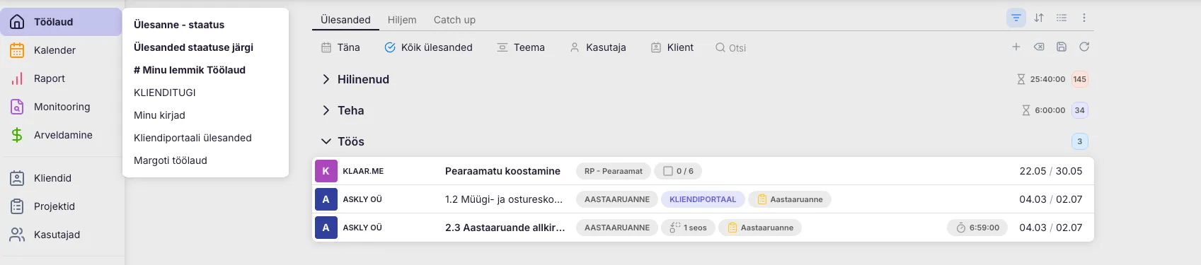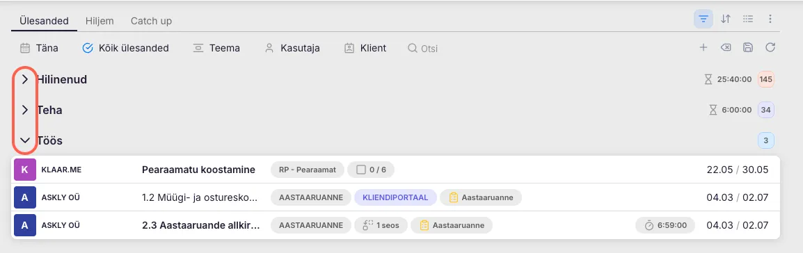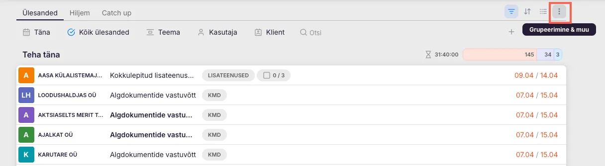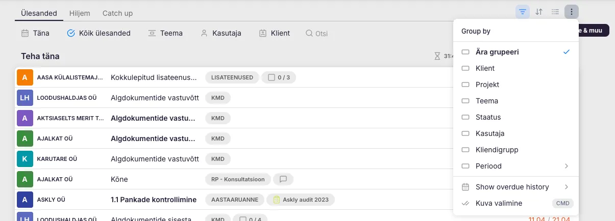 Grupeeri klientide järgi – töölaual kuvatakse vaid klientide nimed. Kliendile vajutades avaneb nimekiri tema ülesannetest.