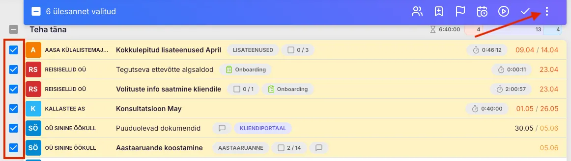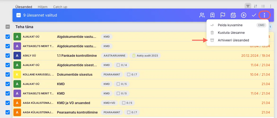 Section titled “Ülesannete arhiveerimine”- Vali Töölaual ülesanded, mida soovid arhiveerida.