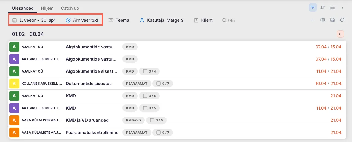 NB! Kui hiljem tekib vajadus arhiveeritud ülesannet otsida või üle vaadata, siis kasuta filtreid: vali sobiv periood ja ülesannete staatuseks “Arhiveeritud”.