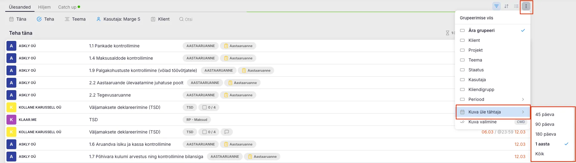 Aegunud ülesannete vaatamine Teine võimalus vanade ülesannete sirvimiseks: kliki Gruppeerimise ikoonile, vali “Kuva üle tähtaja” ja seejärel sobiv periood, kui vanu ülesandeid soovid näha.