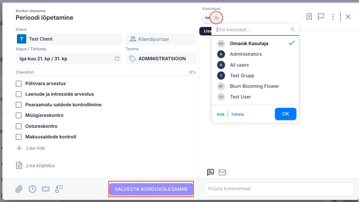 Lilla päise puhul on tegemist korduvülesandega. See tähendab, et ülesanne ilmub kõigile seotud kasutajatele vastava perioodi tagant töölauale. Lisa kasutajad taaskord kasutaja ikoonile vajutades ning veendu, et salvestad korduvülesande vajutades “Salvesta korduvülesanne” nupule.