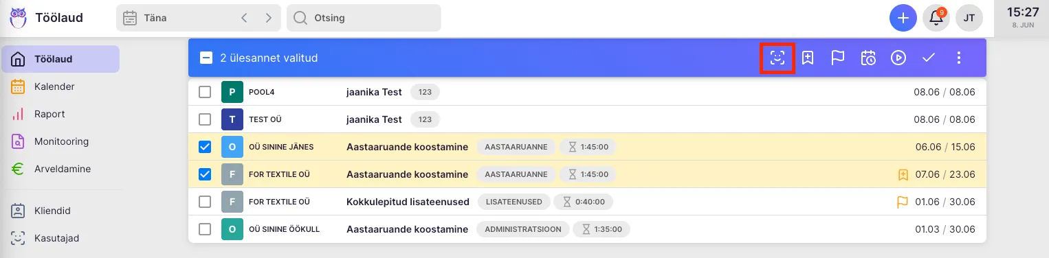 Section titled “Hulgi töölaual”Kliki töölaua vaates kahe linnukesega ikoonile ja vali ülesanded, mida soovid suunata või jagada. Klik kasutaja ikoonil ning vali kolleegid kellega soovid ülesannet jagada.