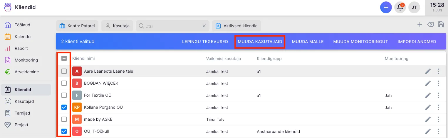 Section titled “Kliendinimekirjas”Vali peamenüüst “Kliendid” ja pane linnuke ette nendele klientidele, kelle ülesandeid soovid jagada või suunata. Seejärel vali ülemisest menüüst “Muuda kasutajaid”.