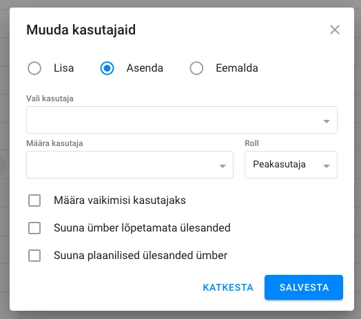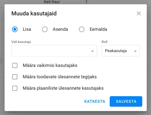 Sulle avaneb valik kasutajate lisamiseks, asendamiseks ja eemaldamiseks.