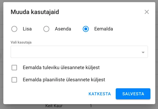 Section titled “Kasutajat eemaldades on võimalik:”- Eemaldada kasutaja tuleviku ülesannete küljes.