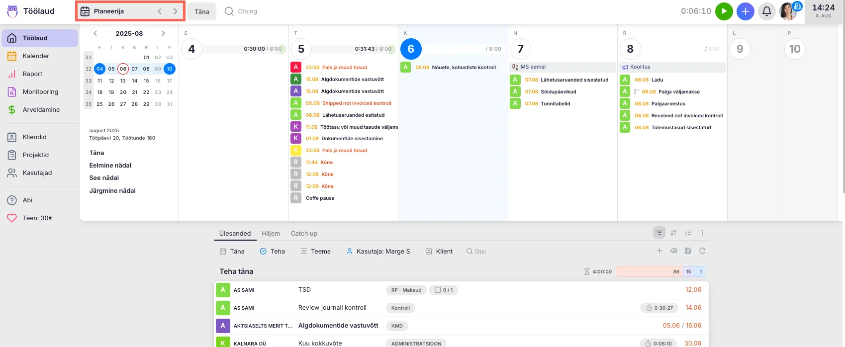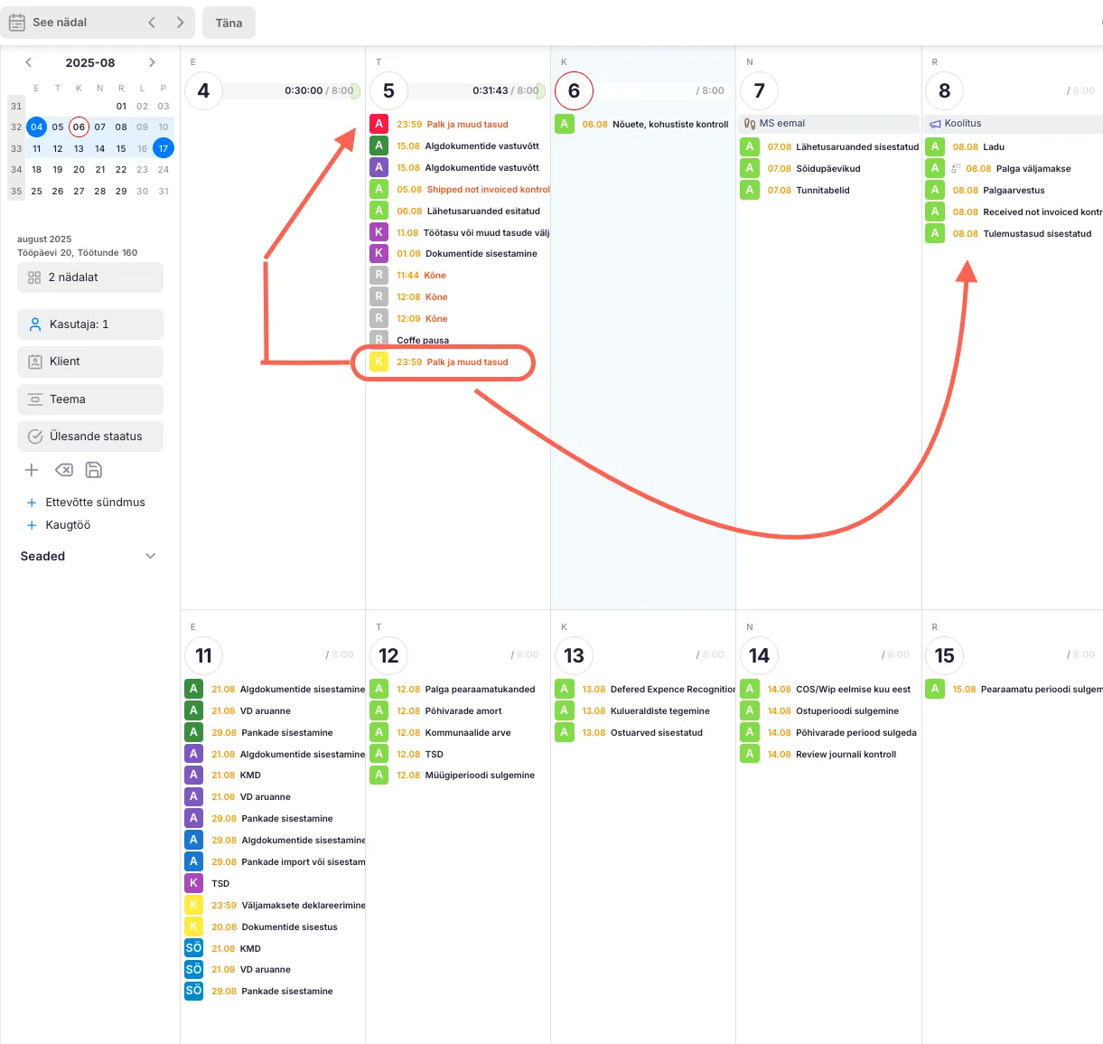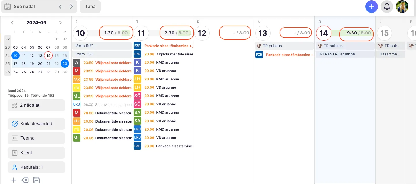 Section titled “Raamatupidaja tööülesannete kalender”Uku töölaual kasutatakse vaikimisi tööde nimekirja vaadet, kuid sellele saab lisada ka kalendrivaadet. Kalendris on võimalik planeerida töid nii nädala kui ka päeva lõikes.