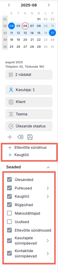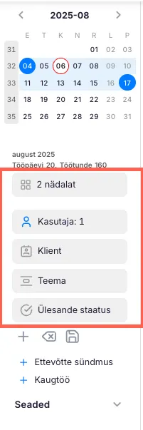 Lisaks saad filtreerida ülesandeid Teemade järgi, valida ühe või mitu klienti ning valida kasutajaid, kelle ülesandeid soovid enda kalendris näha.