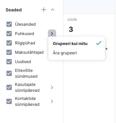Samuti saad valida, kas kalendris kuvatakse ülesanded, puhkused, kolleegide sünnipäevad ning ettevõtte kontaktide sünnipäevad. Lihtsalt märgi või eemalda vastav märkeruut — info ilmub kalendrisse või kaob sealt vastavalt sinu valikule.
