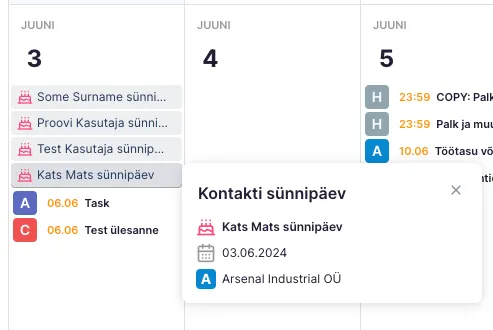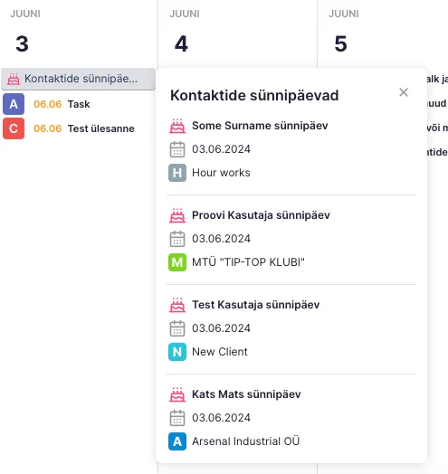 Kui on aktiivne valik “Ära grupeeri”, siis kõik sünnipäevad ja puhkused on eraldi näha ning klõpsates sünnipäeva ribale kuvatakse rohkem infot.