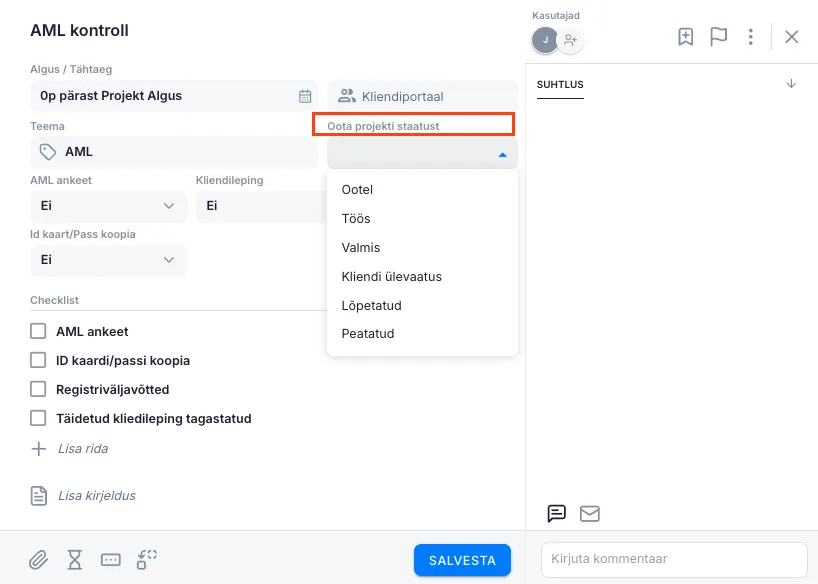 Projektistaatused annavad kiire ülevaate töövoo etappidest. Olgu tegu tuludeklaratsioonide läbivaatusega või uute klientide liidestamisega—staatused aitavad meeskonnal mõista projekti seisu ilma iga ülesannet avamata.