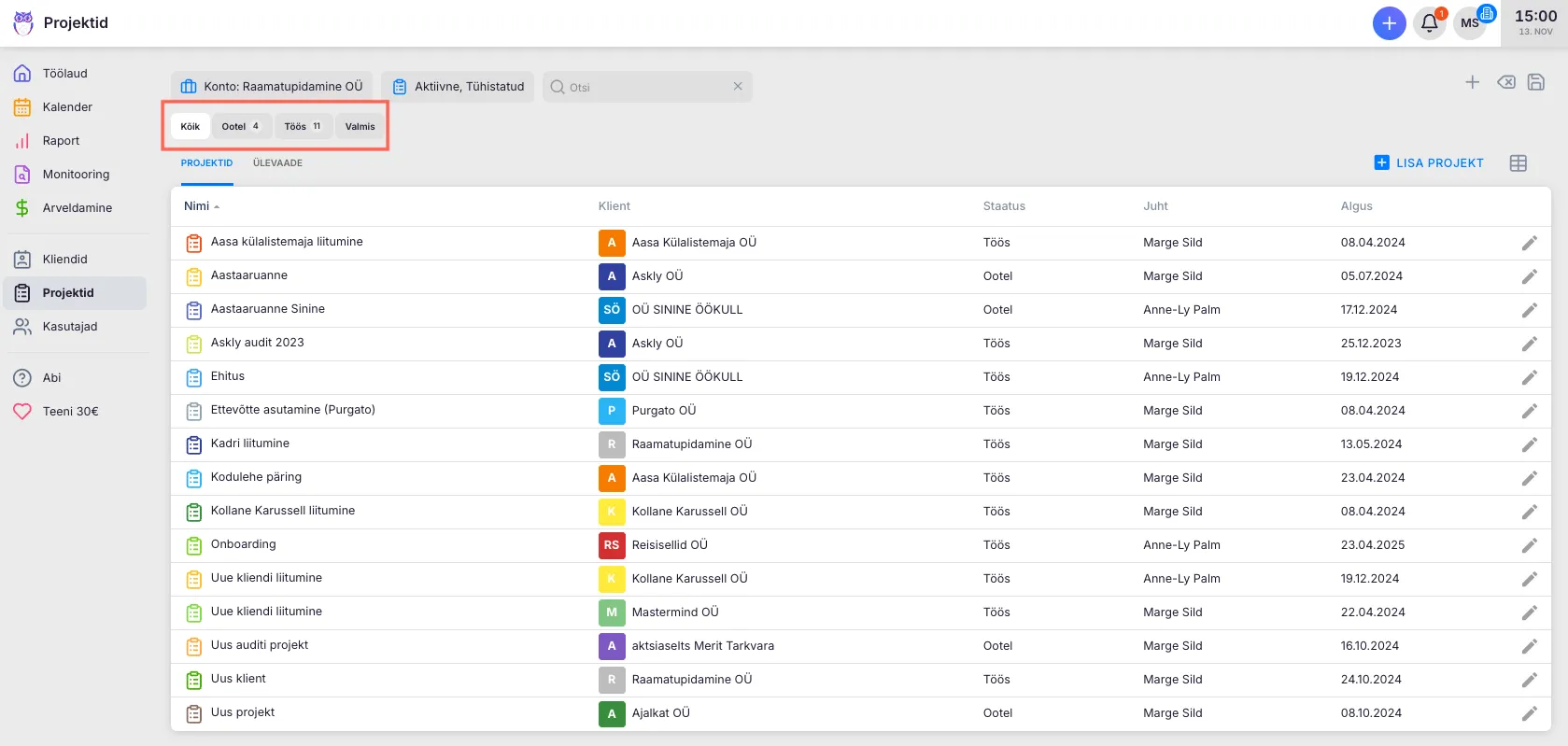 Section titled “Projektilisti vaade”Projektilist koondab kõik projektid nende praeguse staatuse järgi.