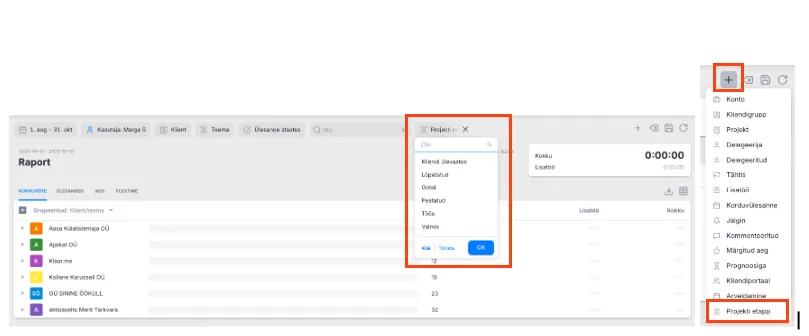 Lisa vajadusel teisi filtreid (kuupäevavahemik, tiimiliikmed, kliendid)
