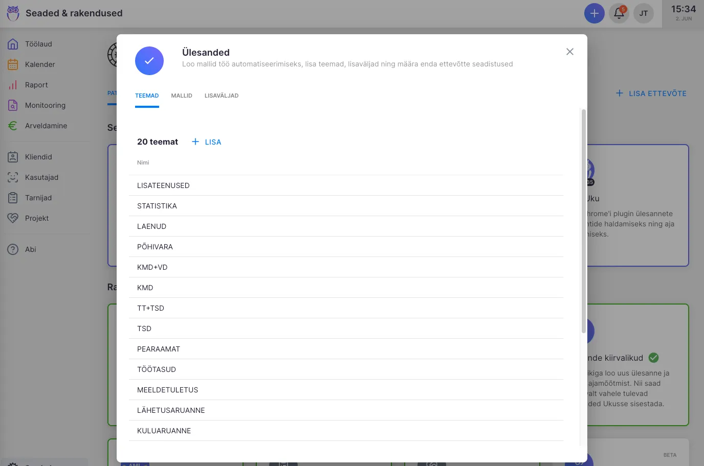 Kui lisad uue raamatupidamisega seotud ettevõtte, saad valida juba loodud teemade seast. Soovitame need vastavalt oma büroo vajadustele kohandada. Seadetes on võimalus ka teemasid lisada, muuta ja kustutada. Vajadusel saavad Omanik ja Admin kasutajad Seadetes keelata tavakasutajatel uute teemade lisamise. Loe lähemalt ülesannete seadistuste kohta.