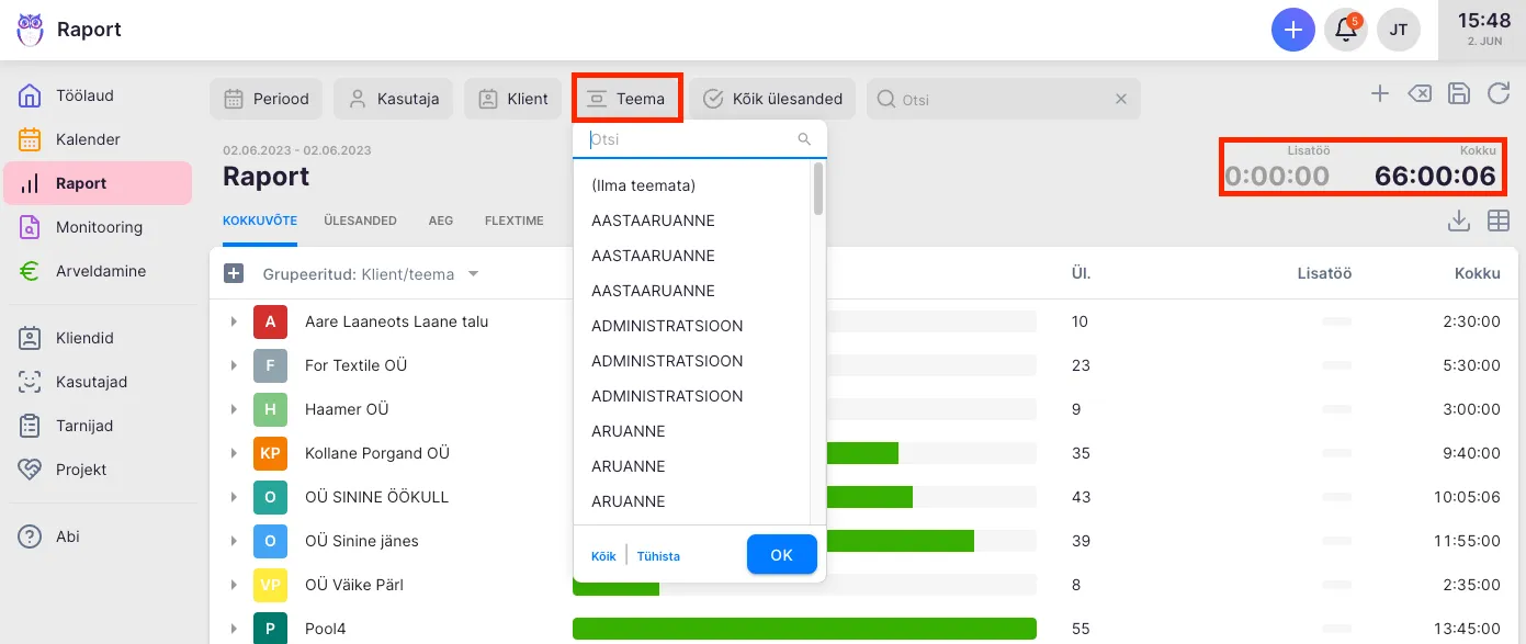 - Raportis - Saad ülesandeid ja nendele kulutatud aega teemade järgi filtreerida ja vaadata. Rohkemate võimaluste kohta raportis saad lugeda siit.