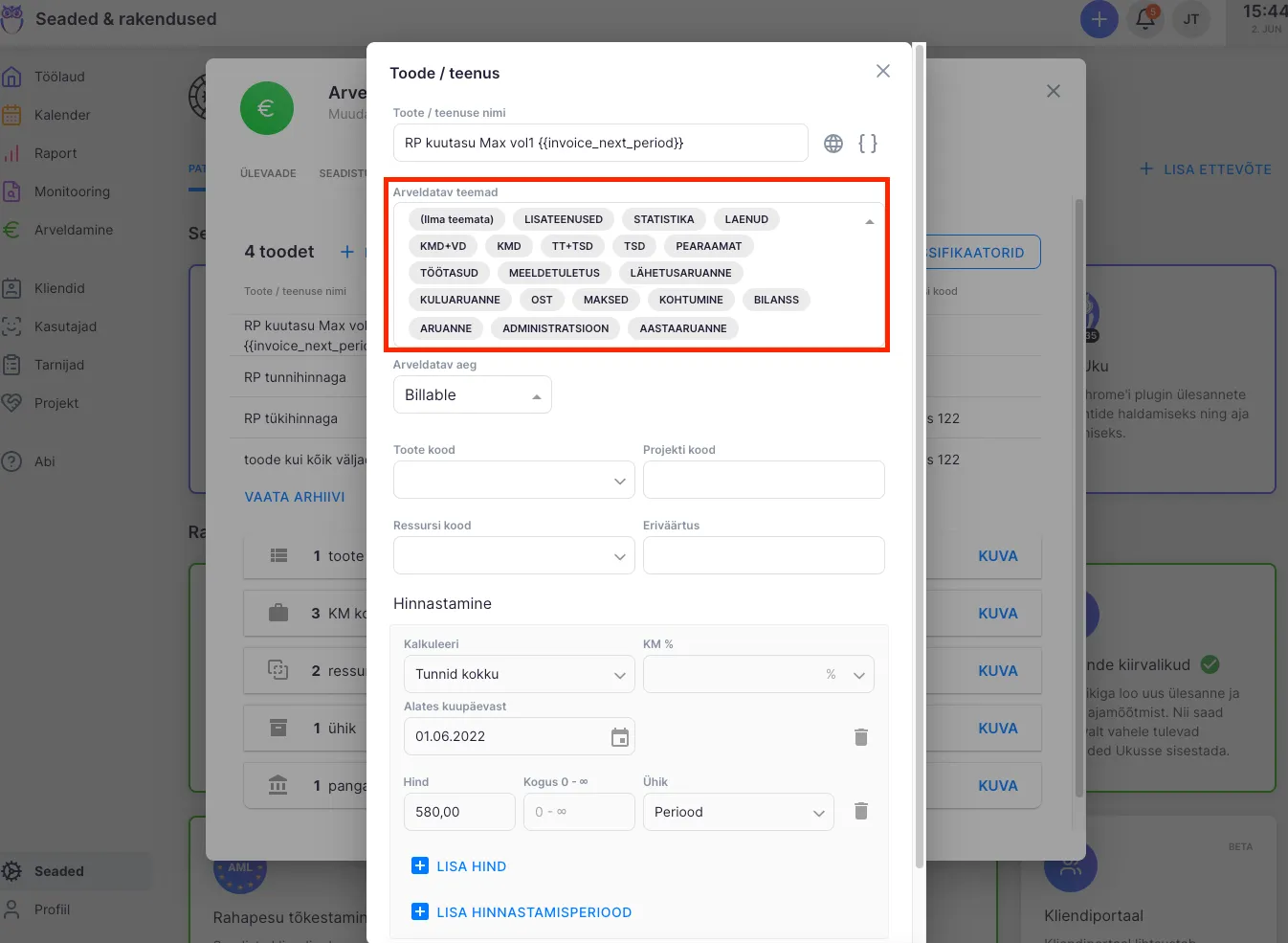 - Arveldamises - Toodet luues saad lisada teemad, mida arveldatakse. Nii saab määrata, mis teemade aeg kajastub või ei kajastu arvel. Kui tootele ei ole teema määratud, arveldatakse automaatselt kõik teemad. Rohkemate võimaluste kohta arveldamises saad lugeda siit.