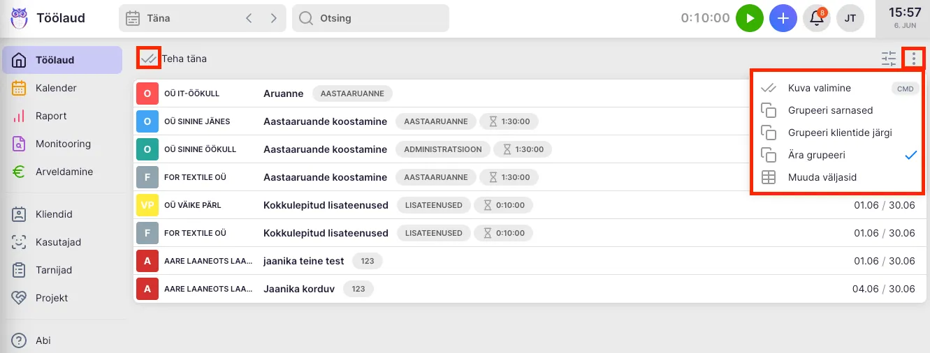 Section titled “Kuidas kustutada mitut ülesannet korraga?”- Vajuta töölaual “:” nupule ja vali “Kuva valimine” VÕI kliki kahe linnukese ikoonil. Samuti saad kiirvalikuna kasutada Mac arvutitel “Command” nuppu ning Windows arvutitel “Control” nuppu.