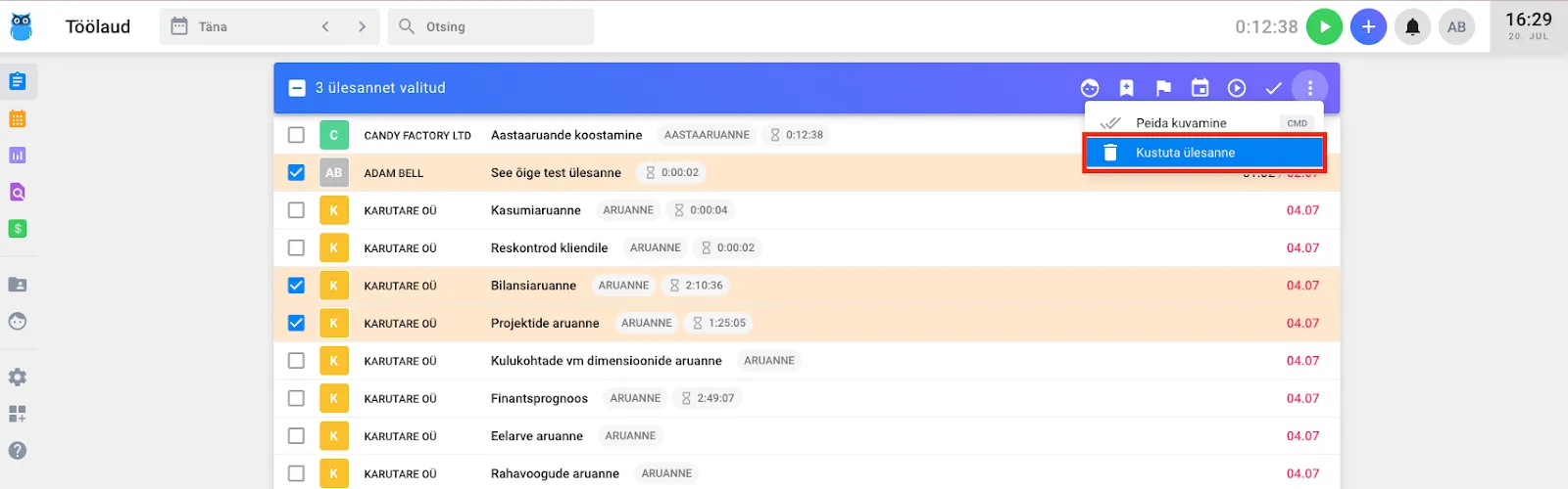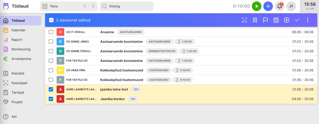Section titled “Ebavajalikud ülesanded saab lihtsasti töölaualt eemaldada”Kui ülesanne Uku töölaual eesmärki ei täida on võimalik see eemaldada. Ülesandeid on võimalik kustutada nii üksikult ja mitme kaupa (hulgitoiminguna).