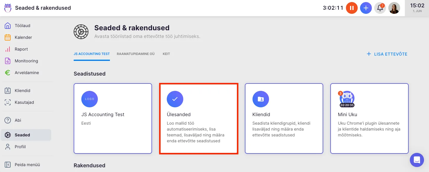 Section titled “Kliendi korduvülesannete plaani moodustamiseks on mitu võimalust. Kui teed tööd koos tiimiga, on ettevõtte konto alla mõistlik lisada mallid, mida kõik oma plaanide aluseks saavad võtta. Nii kasutate samu töövõtteid, teemasid ja lisavälju.”Malli lisamiseks on vajalik ettevõtte konto. Mallid ja nende lisamisvõimaluse leiad, kui liigud peamenüüst “Seaded” alla ning valid “Ülesanded”.