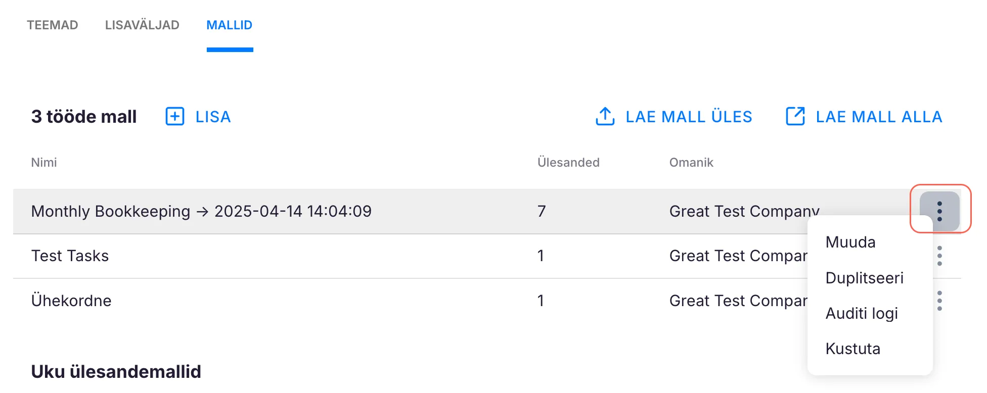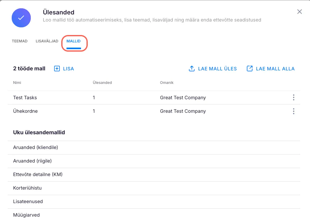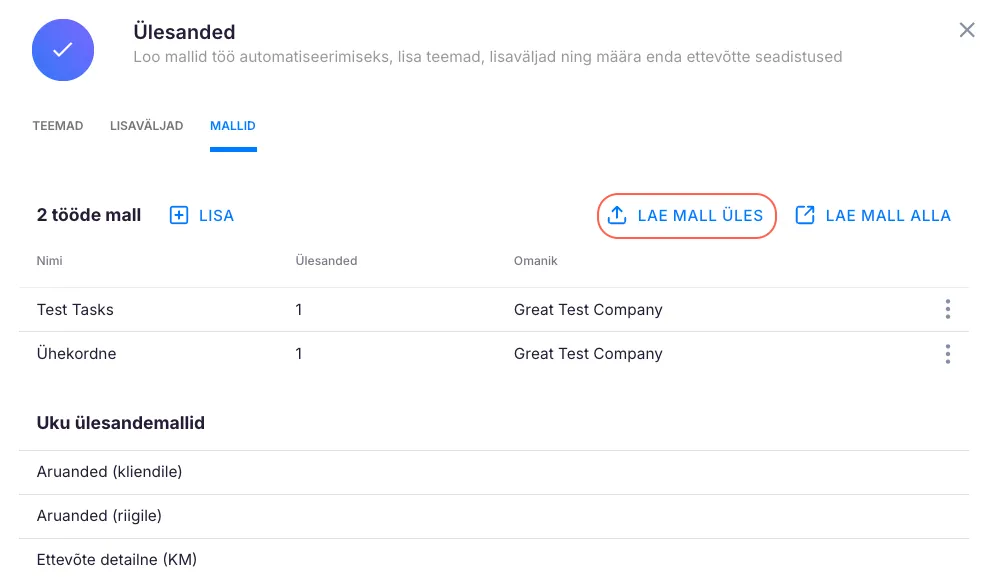 Section titled “Kuidas laadida ülesandemall exceli failina Ukusse”Valmista oma ettevõtte ülesande mall Exceli failis. Näidised leiad siit. Kui oled malli koostanud, mine menüüsse Mallid ja klõpsa “Lae mall üles”.