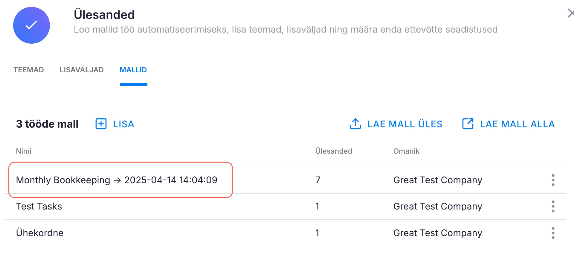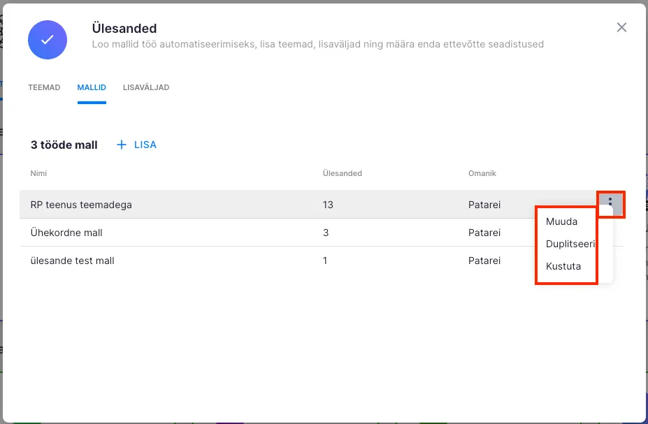 Lisatud malli saab muuta valides Seadetest Ülesanded ning avades Mallid vahekaardi.