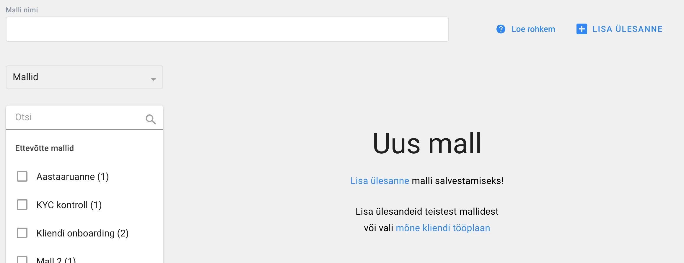Section titled “Kuidas koostada mall käsitsi.”Uue malli lisamiseks vajuta ”+ Lisa”. Esimesena tuleb anda mallile nimi, mis seda võimalikult hästi kirjeldab. Kuna ühele kliendile on võimalik lisada mitu malli, tasub kaaluda väiksemate moodulite moodustamist. Vajalike moodulite valimisega tekib hiljem kliendile sobiv plaan. Nii näiteks saab eraldi malli teha aastaaruandele ning valida see ainult klientide puhul, kellele aastaaruannet koostama peab.