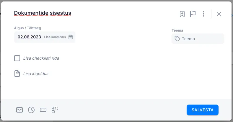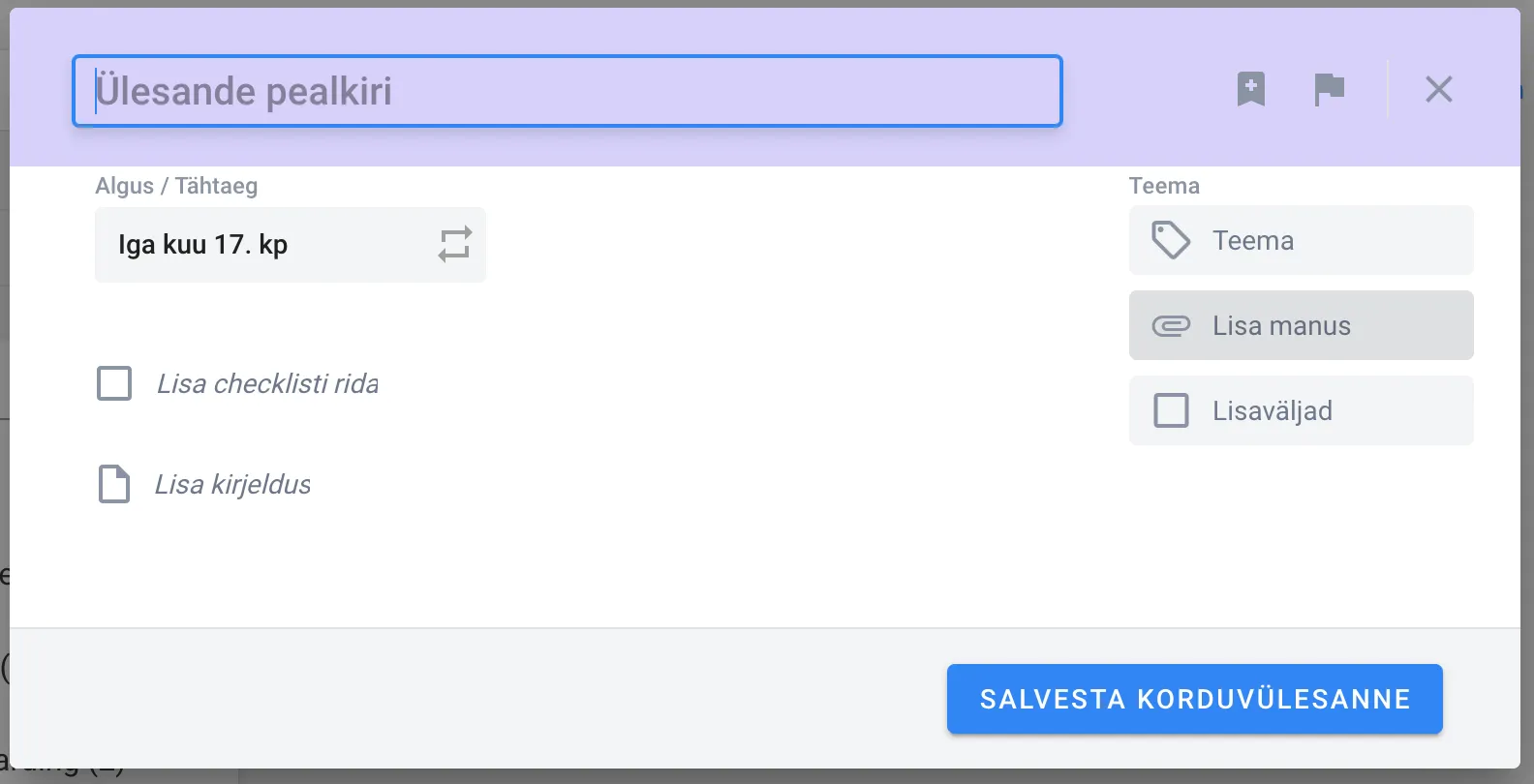 Malli lisatavate ülesannete puhul ei määrata klienti ega tegijat, kõik ülejäänud andmed saab täita, nagu tavalise uue ülesande lisamise puhul. Lisatavad ülesanded on vaikimisi korduvad, millest annab aimu lilla päis.