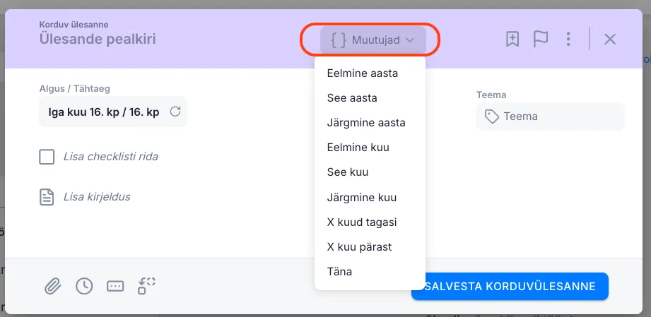 Ülesande pealkirjale saab lisada perioodi, et selgitada, millise ajavahemikuga ülesanne on seotud. Selleks klõpsa valikul “Muutujad” ja vali sobiv periood loendist.