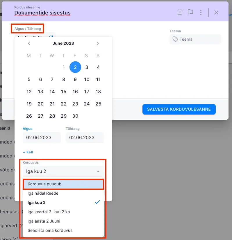 Selleks, et lisada ühekordset ülesannet, vali ‘Algus/Tähtaeg’ valikust ‘Korduvus puudub’.
