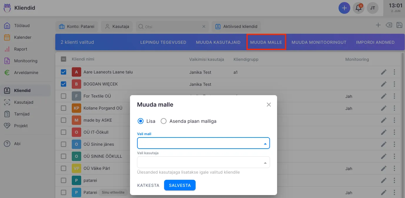 Malle saab lisada mitmele kliendile korraga. Selleks vali peamenüüs “Kliendid”. Vali kliendid, kellele antud malli soovid lisada ning kliki “Muuda malle” nupule. Seejärel saad nimekirjast valida sobiva malli ning valiku salvestada. NB kliendinimekirjast saab lisada VAID enda salvestatud malle, mitte Uku näidismalle. Selleks ,et lisada juba Ukus olevaid malle, kohanda need omale sobivaks ja salvesta üle.